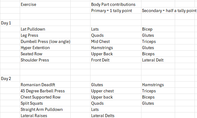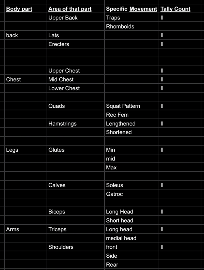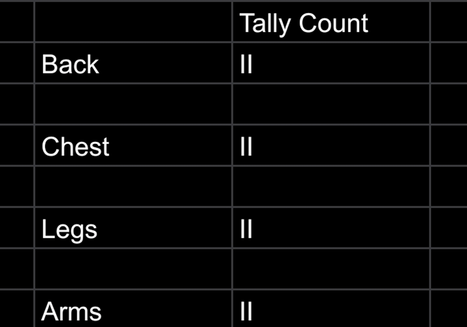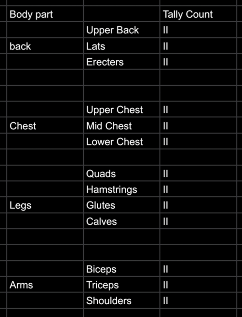At a first glance, you might categorize muscle groups quite broadly. Imagine a simple list like this, where “Tally Count” represents sets per muscle group: